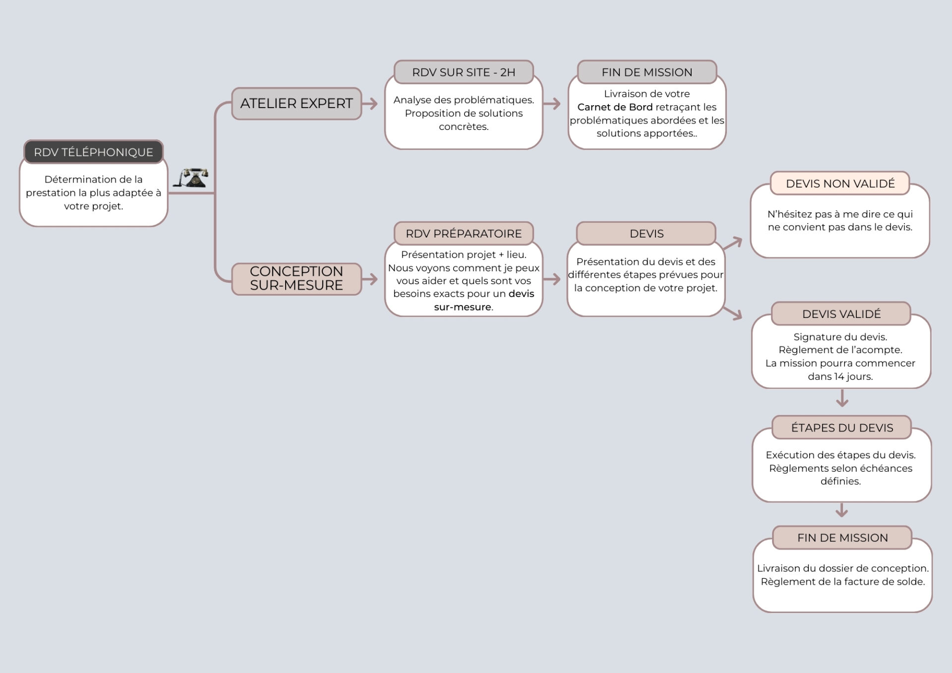 Lors d’un entretien téléphonique, vous me donnez les grandes lignes de votre projet et nous déterminons ensemble la prestation la plus adaptée : l’Atelier Expert ou la Conception sur-mesure.